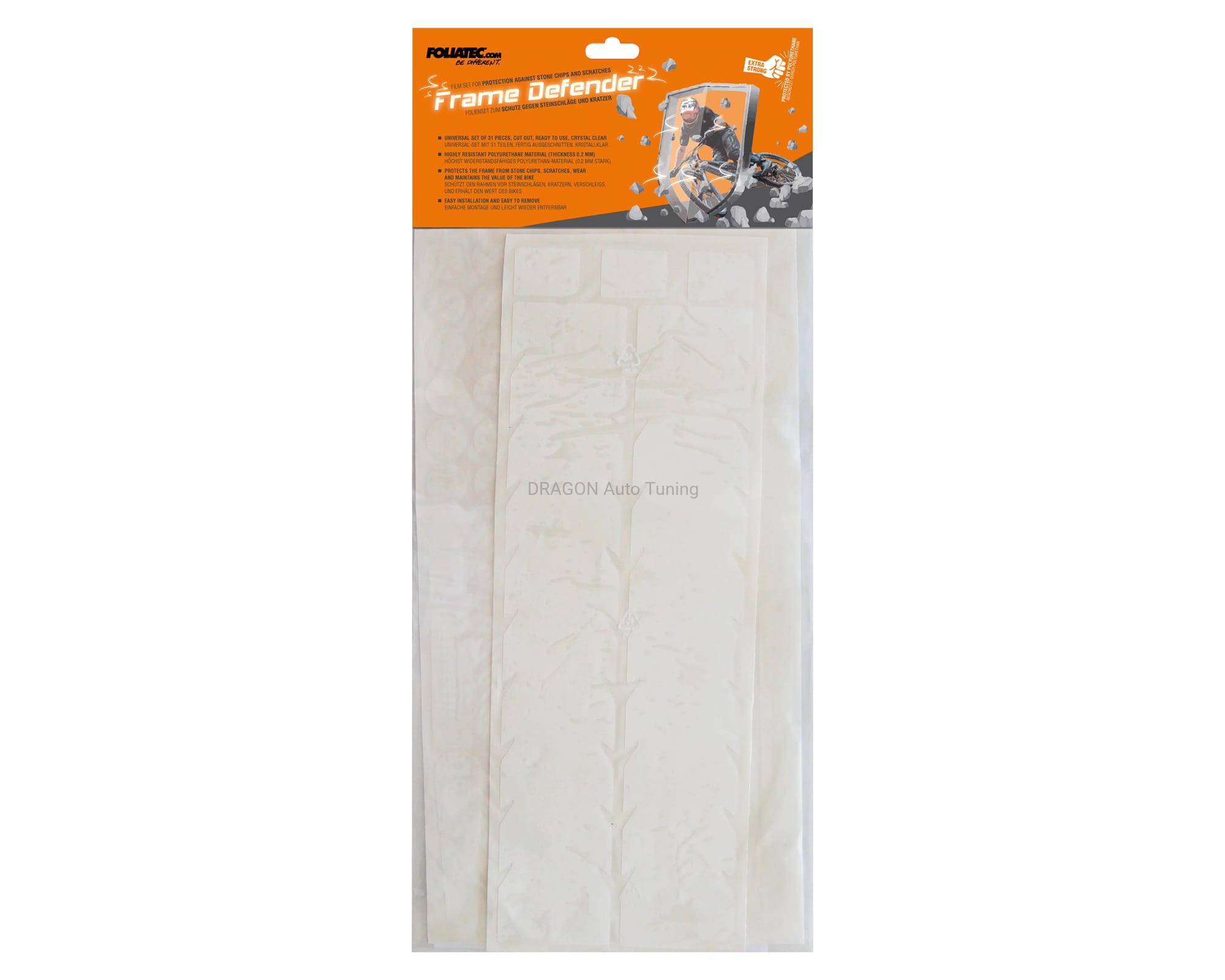 Zestaw folii ochronnych Frame Defender to szybki i łatwy sposób ochrony farby przed wiórami, zadrapaniami, zużyciem i utratą wartości, pomagając utrzymać wartość roweru. 31-częściowy uniwersalny zestaw z wysoce odpornego materiału poliuretanowego (200µ) jest łatwy do nałożenia i usunięcia.